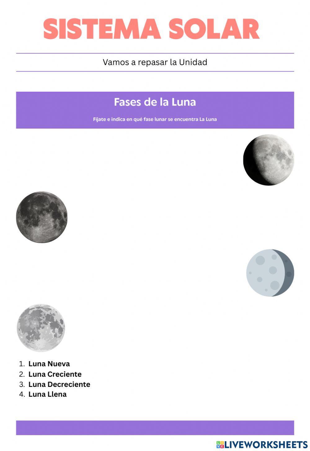 Tal y como hablamos ayer en clase, les comparto una ficha de repaso del Sistema Solar de la web que solemos usar en clase Liveworksheets. Ya saben utilizarla sin problema, sí encuentran alguna dificultad, me pueden escribir un correo electrónico o me avisan por Google Classroom. Al enviarme la ficha, recordad poner simplemente el número de lista.